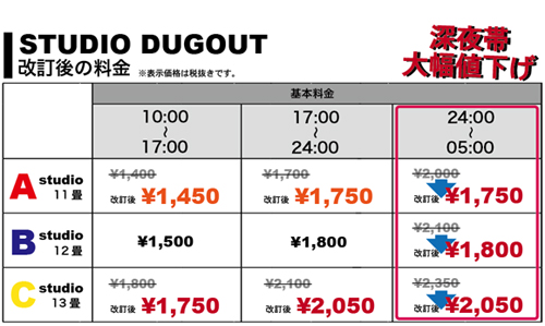 4月1日よりスタジオのご利用料金を一部改訂させて頂きます。